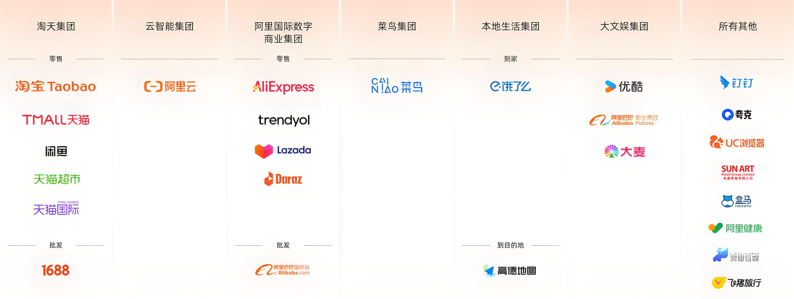 - 零售平台:淘宝(C2C)、天猫(B2C)、天猫国际(进口电商)、全球速卖通(跨境出口)